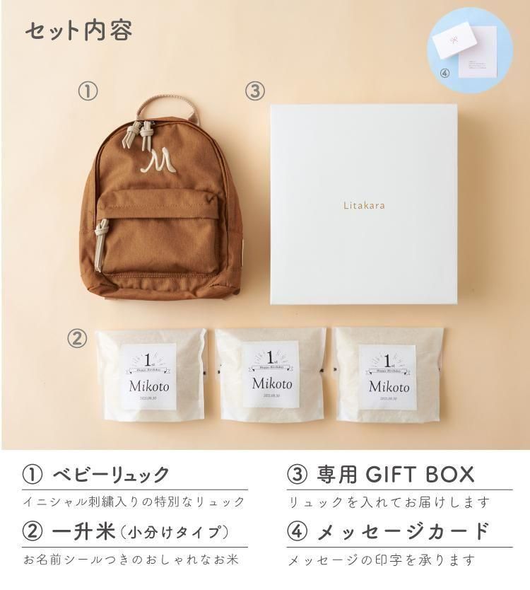 【 令和6年産】1歳 誕生日 一升餅 一升米 小分け 名入れ ベビーリュック セット お祝い 500g×3袋 リュックサック イニシャル 刺繍 emoka