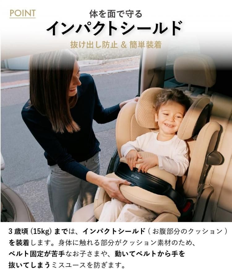 【サイベックス正規販売店】【正規品3年保証】 最新安全基準に対応した、15ヶ月頃〜12歳まで成長に合わせて使えるロングユースシートです。 身長76cmから100cm(15ヵ月〜4歳頃)までは、腹部のインパクトシールドを装着して チャイルドシートとして使用。 身長が100cm以上(※)になりましたら インパクトシールドを取り外し、お車に付属しているシートベルトを使用して ジュニアシートとしてお使いいただけます。 ※より安全にご使用いただく為に、お子さまの身長が105cmに達するまで、インパクトシールド固定でご使用できます。 (ただしお子さまの体重が21kg以上になりましたら、インパクトシールドを取り外してご利用ください。) |