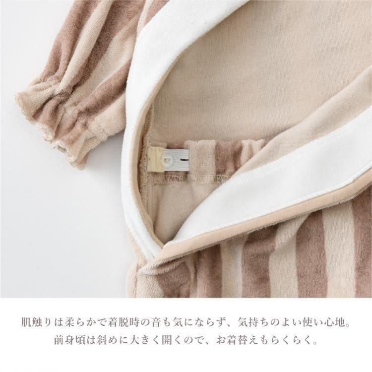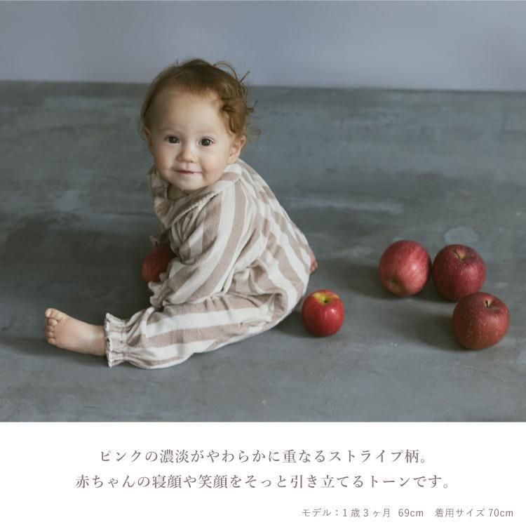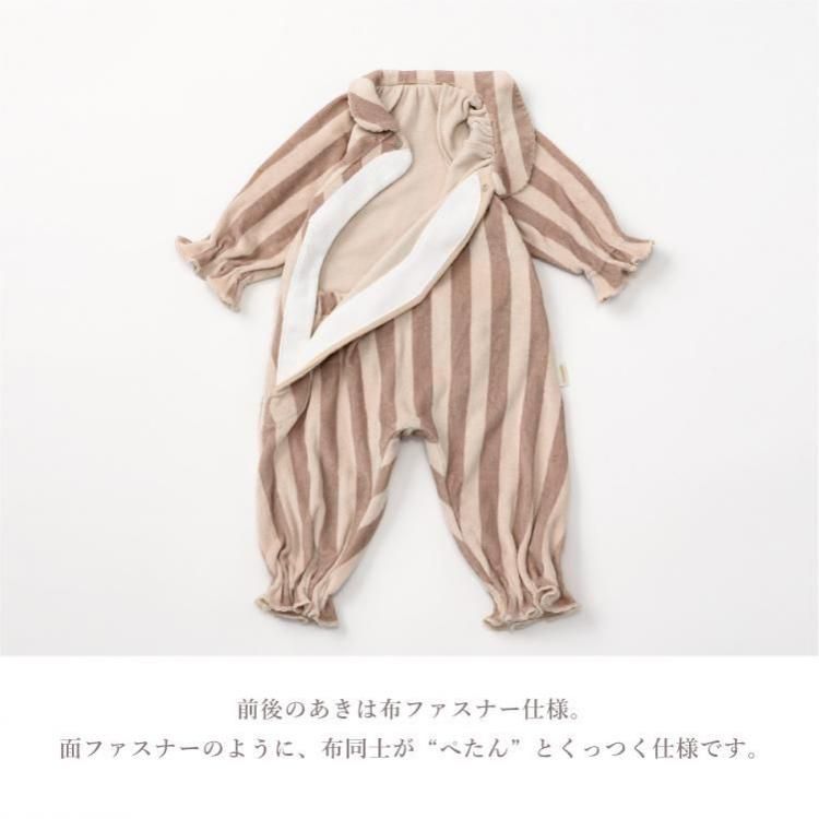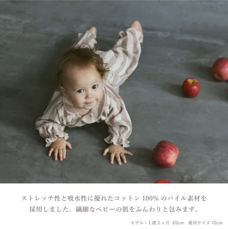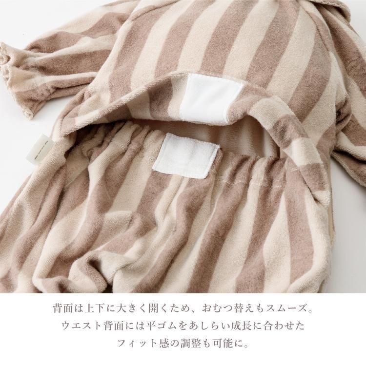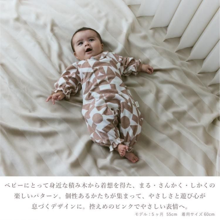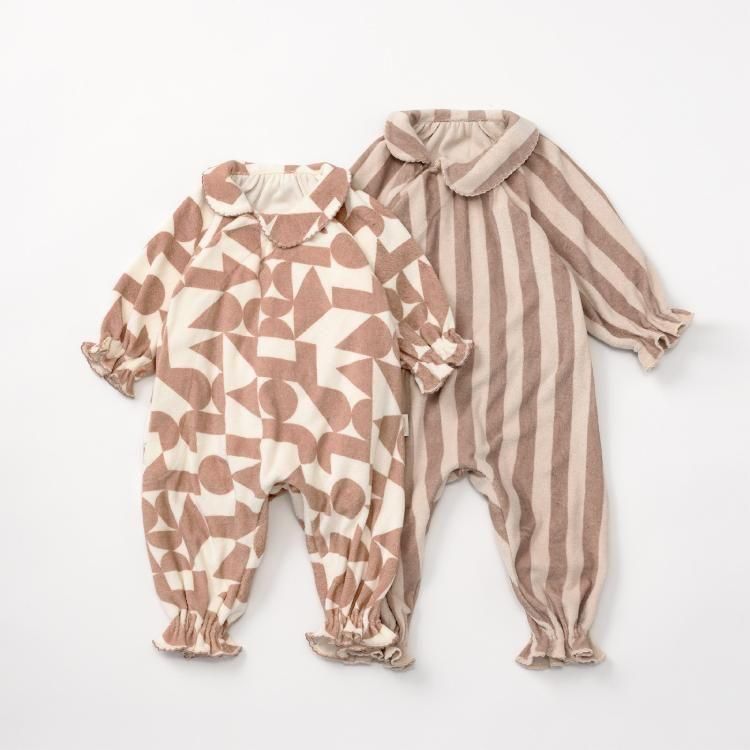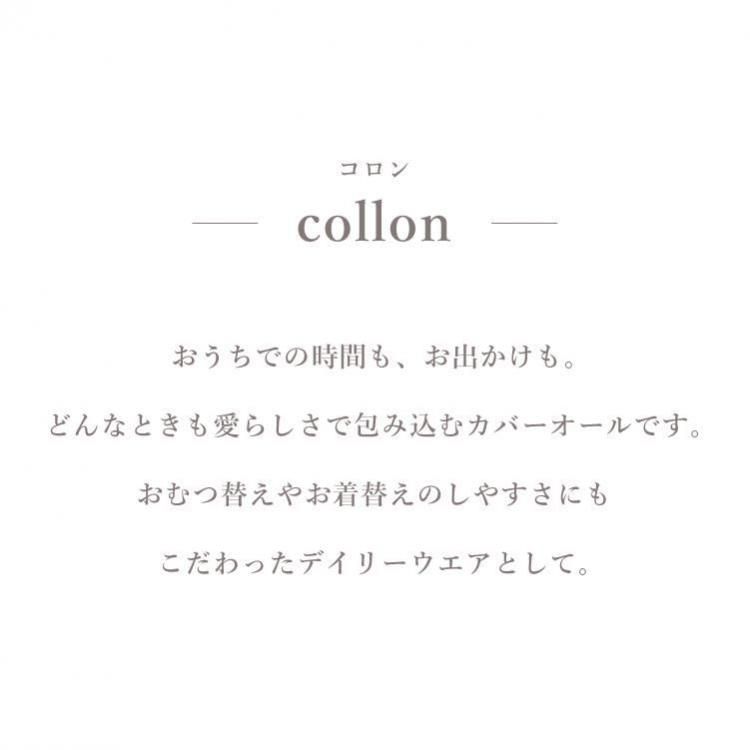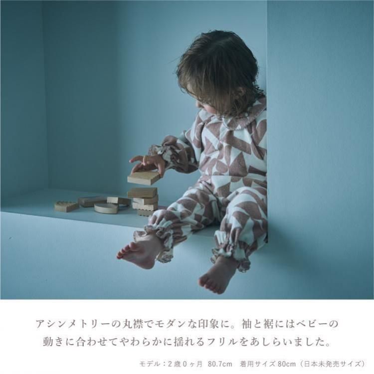 おうちでの時間も、お出かけも。どんなときも愛らしさで包み込むカバーオールです。 お むつ替えやお着替えのしやすさにもこだわったデイリーウェアとして。 アシンメトリーの丸襟でモダンな印象に。袖と裾にはベビーの動きに合わせてやわらかに 揺れるフリルをあしらいました。 ストレッチ性と吸水性に優れたコットン100%のパイル素材を採用しました。繊細なベビーの 肌をふんわりと包みます。 前後のあきは布ファスナー仕様。面ファスナーのように、布同士がぺたん”とくっつく仕様で す。 肌触りは柔らかで着脱時の音も気にならず、気持ちのよい使い心地。 前身頃は斜めに大きく開くので、お着替えもらくらく。 背面は上下に大きく開くため、お むつ替えもスムーズ。 ウエスト背面には平ゴムをあしらい成長に合わせたフィット感の調 整も可能に。 おうちで過ごす時間が長い小さな赤ちゃんにぴったり。出産祝いとしても喜ばれる、実 用性と可愛らしさを備えたアイテムです。 |