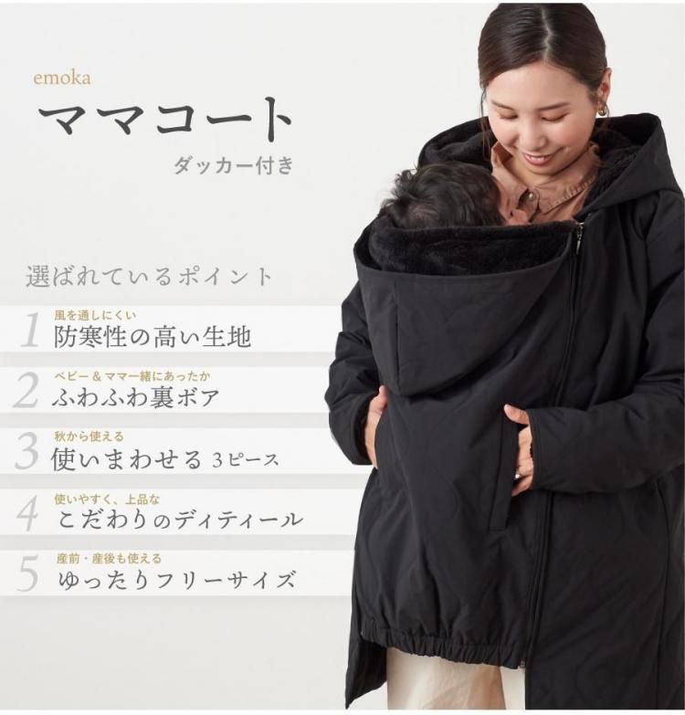 emoka 防寒ママコート(ダッカー付き) 【ママとベビーが一緒にあたたかい】ダッカー付きで抱っこひも対応 【ダッカーを外せばママ用コートに】季節やシーンに合わせて2WAY仕様 【撥水加工&静電気防止生地】冬のおでかけも快適でストレスフリー 【ゆったりフリーサイズ】産前の大きなお腹から産後まで長く着られる 【シームポケット付き】見た目すっきり&収納力◎ 【カンガルーポケット付きダッカー】ママもベビーもぬくぬく快適 【ギフトにも最適】シンプルで上品なデザインで贈り物にも喜ばれる |
