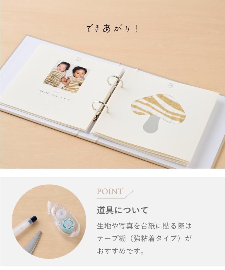 「TUMU」 ツム 服のアルバム 捨てられないお子さまのお洋服を「思い出」として残せる、服のアルバム。 飾っておけるほどシックなデザインで、箔押しの表紙がインテリアにもよく馴染みます。 おしゃれに型抜きされた台紙に、お気に入りのベビー服を貼るだけで特別な1冊に。 お子さまと一緒に手を動かしながら「積む・紡ぐ・重ねる想い出」をカタチにできます。 プレゼントにも喜ばれる、記念に残るアルバムです。 |