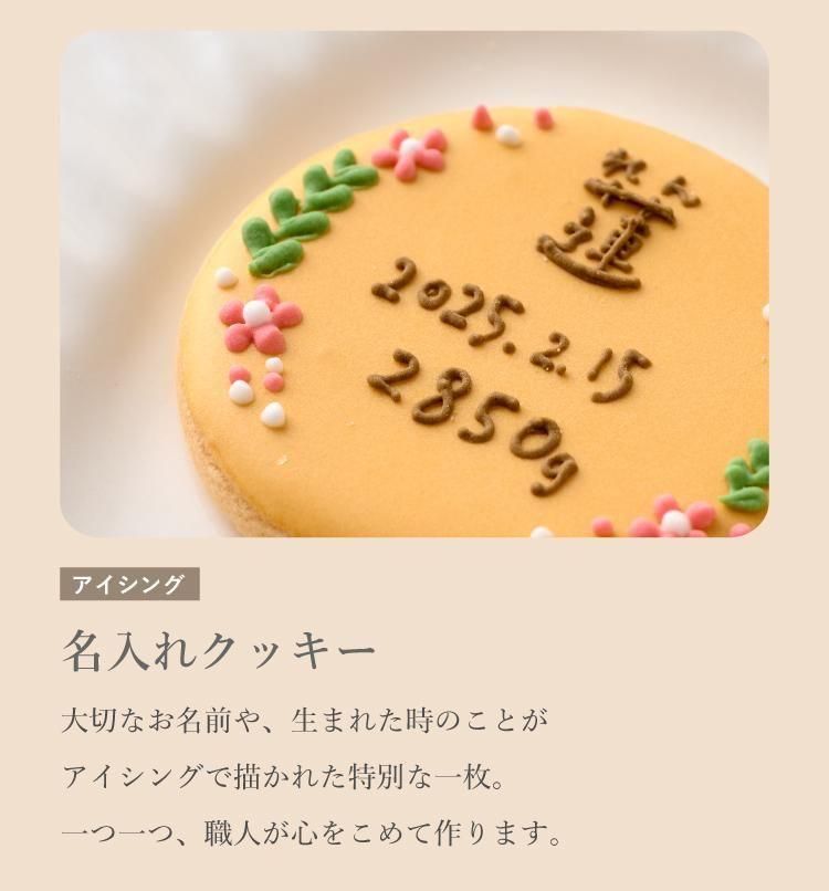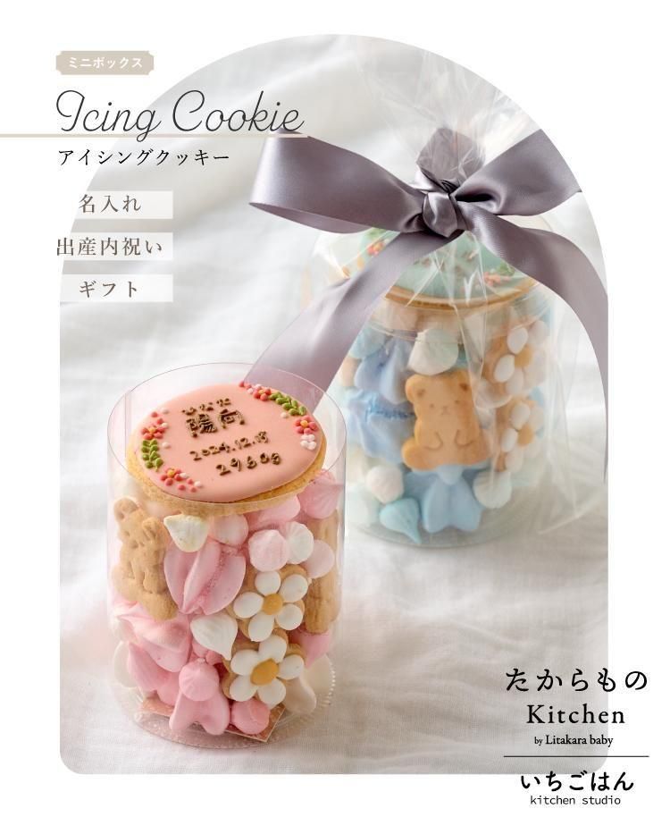 【名入れ アイシングクッキー缶 ミニボックス】 たからもの Kitchen × kitchen studio いちごはん 大切な「お名前」を入れて。 感謝の思いを届ける、アイシングクッキーボックスです。 職人が一つ一つ心をこめて作るアイシングクッキーは、 とてもかわいく、プレゼントにも喜ばれます。 名入れクッキーには、 「お名前」「読み仮名」「生年月日」「出生時体重」が入ります。 「内祝い」や「出産祝い」「プチギフト」はもちろん。 ご自宅用として、ベビーと一緒に写真を撮るのもおすすめです。 < kitchen studio いちごはん > 兵庫県たつの市にある「kitchenstudioいちごはん」は、 “かわいい”をテーマにしたお菓子づくりや料理を提供しています。 素材の味をたいせつに、見た目にも心がときめくクッキーをひとつひとつ丁寧に製造しており、 教室発のスイーツブランドとして、週1回のパフェ専門店や月1回のクッキー詰め放題イベントを開催し、 「おいしい・たのしい・かわいい」を届ける場所として地域に親しまれています。 たからものKitchenでは、実際にお会いして信頼のできるパン屋さんにお願いしております。 kitchen studio いちごはん 様 とのコラボレーションにより、実現したプロジェクトです。 |