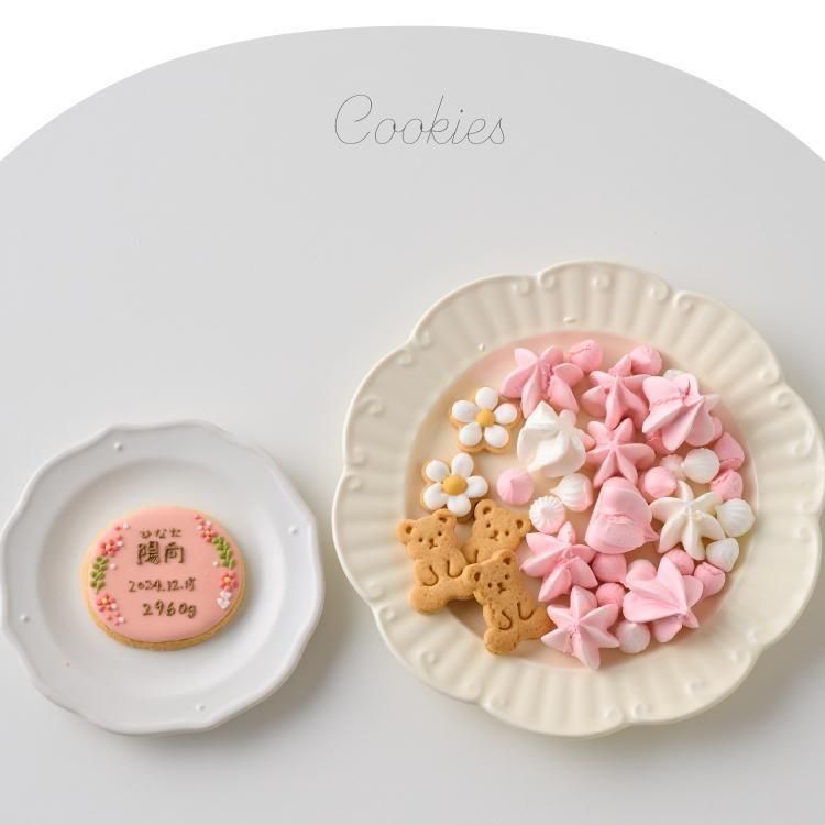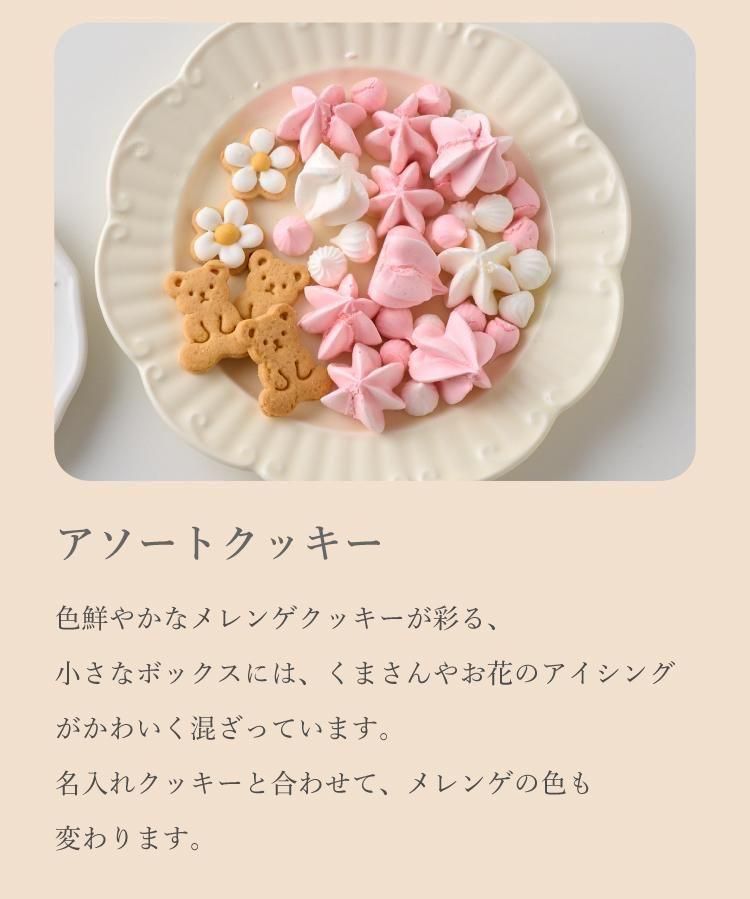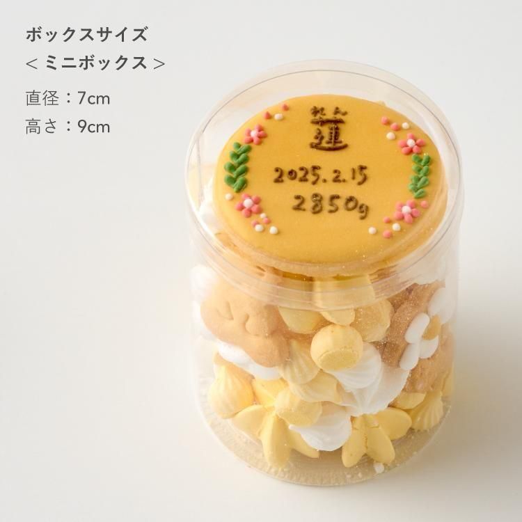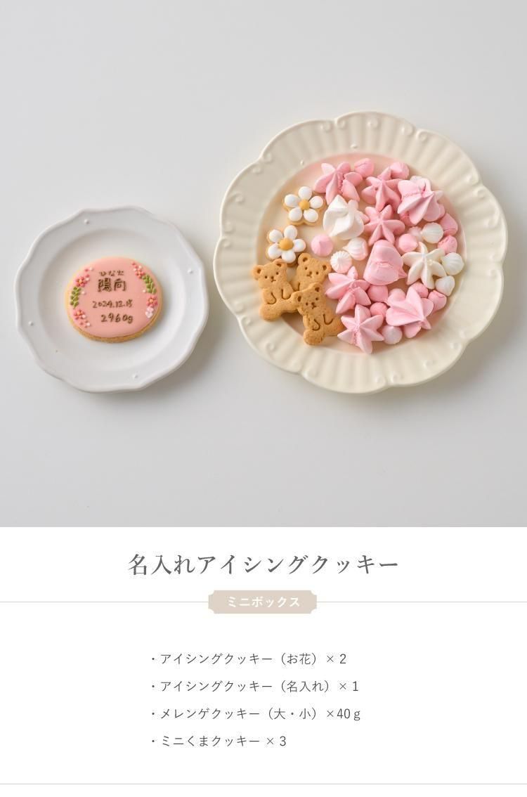 ミニボックス 直径 7cm / 高さ 9cm クッキー内容 ・アイシングクッキー(お花)×2 ・アイシングクッキー(名入れ)×1 ・メレンゲクッキー(大・小)40g ・ミニくまクッキー×3 |