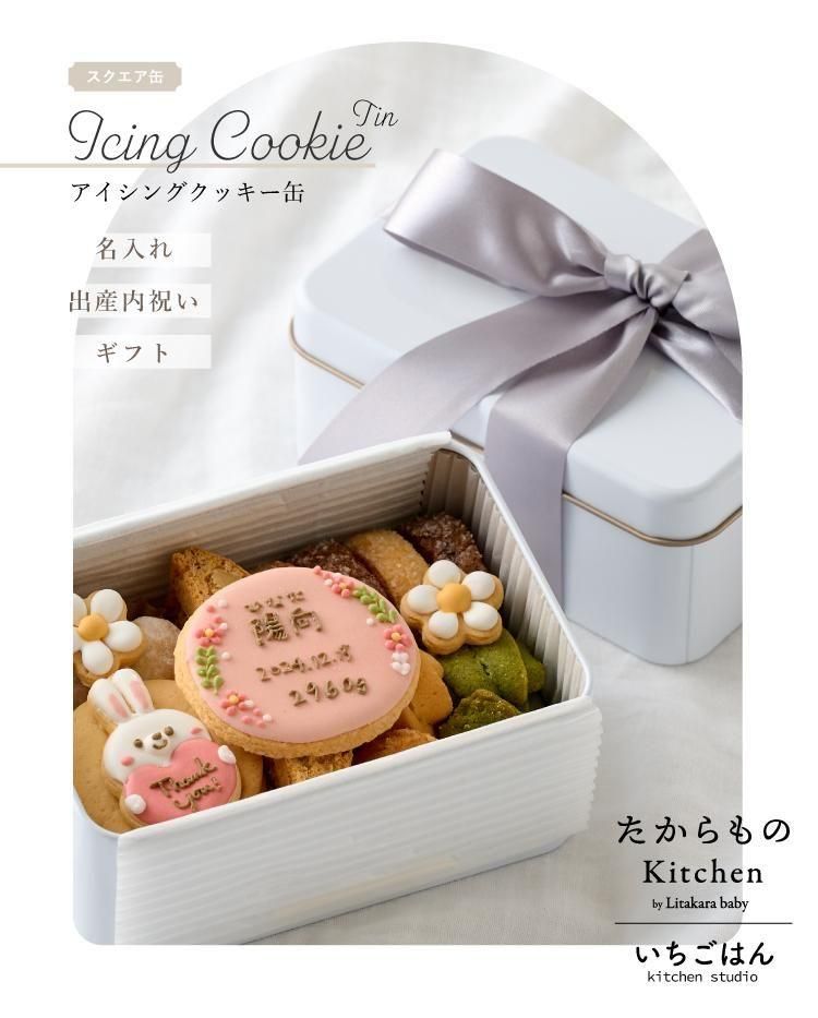 【名入れミドル缶】内祝い クッキー缶 クッキー お菓子 名入れ お名前 出産祝い 出産内祝い お返し アイシングクッキー アソートクッキー いちごはん たからものキッチン Litakara