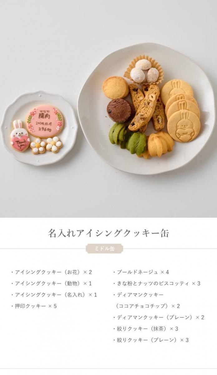 ミドル缶 8cm × 12.7cm × 5.5cm クッキー内容 ・アイシングクッキー(お花)×2 ・アイシングクッキー(動物)×1 ・アイシングクッキー(名入れ)×1 ・押印クッキー×5 ・ブールドネージュ×4 ・きな粉とナッツのビスコッティ×3 ・ディアマンクッキー(ココアチョコチップ)×2 ・ディアマンクッキー(プレーン)×2 ・絞りクッキー(抹茶)×3 ・絞りクッキー(プレーン)×3 |
