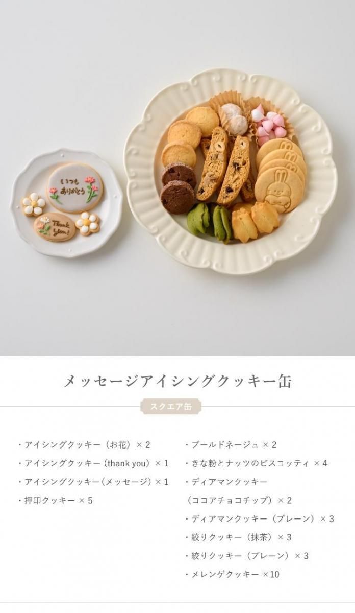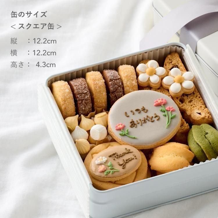 スクエア缶 12.2cm × 12.2cm × 4.3cm クッキー内容 ・アイシングクッキー(お花)×2 ・アイシングクッキー(動物)×1 ・アイシングクッキー(メッセージ)×1 ・押印クッキー×4 ・ブールドネージュ×2 ・きな粉とナッツのビスコッティ×4 ・ディアマンクッキー(ココアチョコチップ)×2 ・ディアマンクッキー(プレーン)×3 ・絞りクッキー(抹茶)×3 ・絞りクッキー(プレーン)×3 ・メレンゲクッキー×10 |