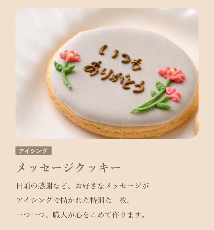 【メッセージ アイシングクッキー缶 スクエア缶】 たからもの Kitchen × kitchen studio いちごはん 大切な「お名前」を入れて。 感謝の思いを届ける、アイシングクッキー缶です。 職人が一つ一つ心をこめて作るアイシングクッキーは、 とてもかわいく、プレゼントにも喜ばれます。 メッセージクッキーには、 お好きなメッセージを入れることができます。 (10文字前後) < kitchen studio いちごはん > 兵庫県たつの市にある「kitchenstudioいちごはん」は、 “かわいい”をテーマにしたお菓子づくりや料理を提供しています。 素材の味をたいせつに、見た目にも心がときめくクッキーをひとつひとつ丁寧に製造しており、 教室発のスイーツブランドとして、週1回のパフェ専門店や月1回のクッキー詰め放題イベントを開催し、 「おいしい・たのしい・かわいい」を届ける場所として地域に親しまれています。 たからものKitchenでは、実際にお会いして信頼のできるパン屋さんにお願いしております。 kitchen studio いちごはん 様 とのコラボレーションにより、実現したプロジェクトです。 |