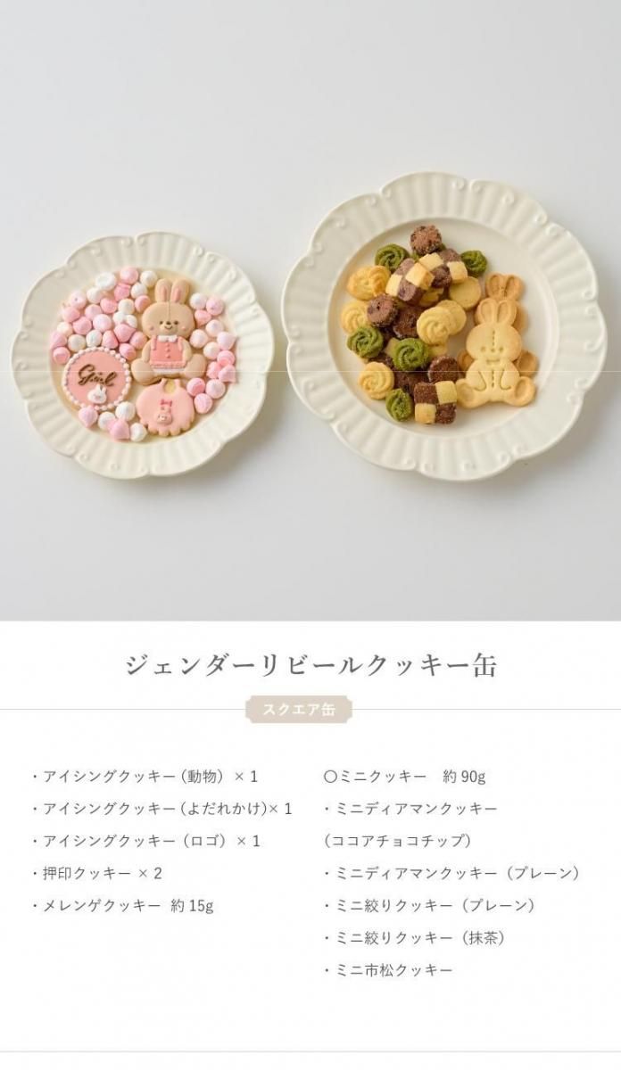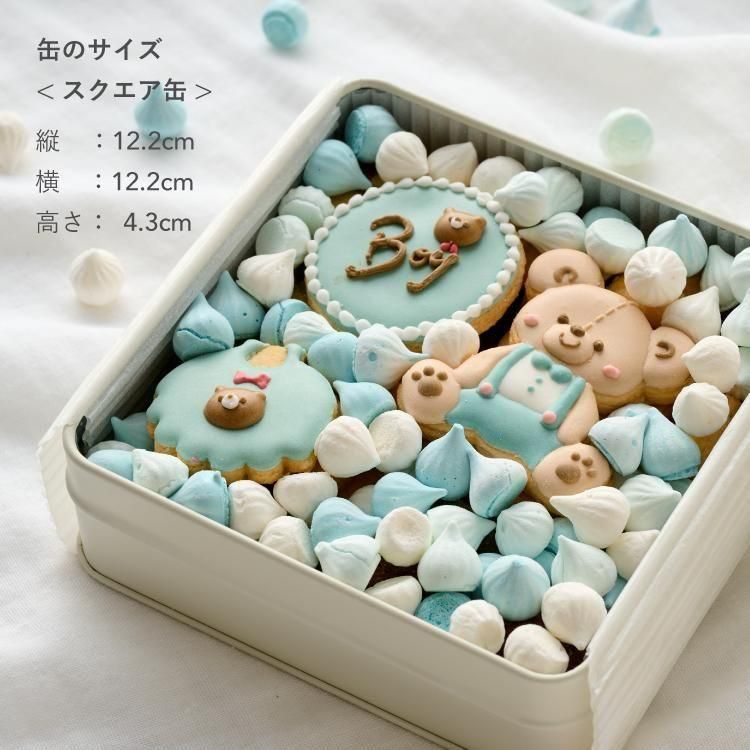 スクエア缶 12.2cm × 12.2cm × 4.3cm クッキー内容 ・アイシングクッキー(動物)×1 ・アイシングクッキー(よだれかけ)×1 ・アイシングクッキー(ロゴ)×1 ・押印クッキー×2 ・メレンゲクッキー 約15g 〇ミニクッキー 約90g ・ミニディアマンクッキー(ココアチョコチップ) ・ミニディアマンクッキー(プレーン) ・ミニ絞りクッキー(プレーン) ・ミニ絞りクッキー(抹茶) ・ミニ市松クッキー |