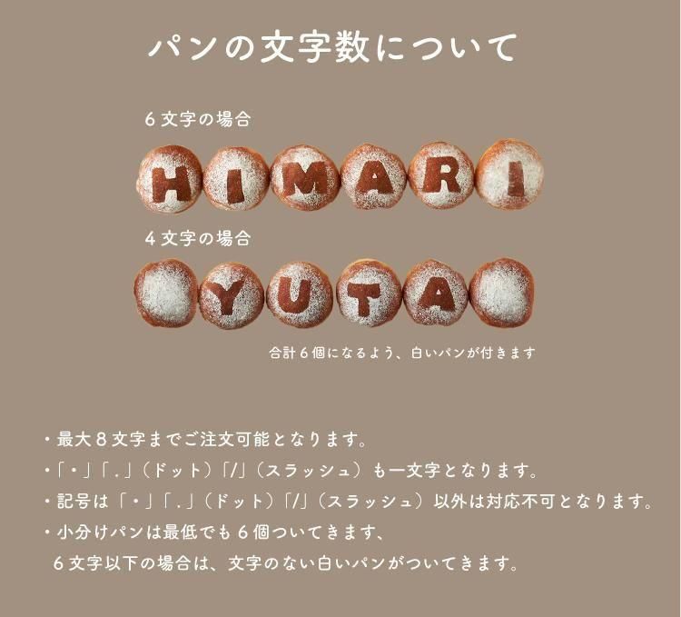 [パン] 小さいパン:直径 約12cm (文字数により6-8個) ※サイズは個数により変わる場合がございます ※自家製の天然酵母を扱っておりますので、気温などの環境の変化により、 大きさや形が綺麗な丸にならないことがあったり、しわが入ってしまうことがございます。 ご了承いただいた上でご注文をお願いいたします。 ※品質向上のため、仕様を変更することがございますのでご了承願います。 |